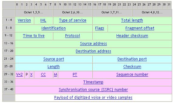 根據(jù)IETF的標(biāo)準(zhǔn)建議,通過IP網(wǎng)絡(luò)傳輸語音信號樣本需要增加三個(gè)額外的報(bào)頭,每個(gè)報(bào)頭對應(yīng)一個(gè)網(wǎng)絡(luò)層次,即IP,UDP和RTP [4]。