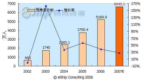 從圖中可以看出,中國的寬帶用戶數(shù)保持了快速的發(fā)展勢頭,從2002-2007年年均增長率為58.7%,至2007年,國內(nèi)的寬帶用戶數(shù)將達(dá)到6640.1萬。