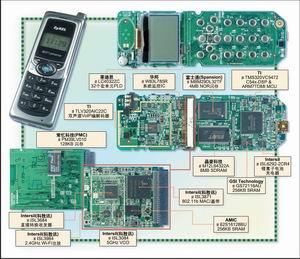 Wi-Fi功能由科勝訊(Conexant)的Prism3 802.11b芯片組完成,是一款傳統(tǒng)的專業(yè)方案。科勝訊通過收購GlobeSpan-Virata得到Prism3 802.11b,而GlobeSpan-Virata之前購買了Intersil的Wi-Fi芯片組業(yè)務,所以Prism3組件仍打著Intersil的標識。以目前的標準看,Prism3總體Wi-Fi方案的集成度不算太高。ISL3871基帶/媒體存取控制芯片與ISL3684收發(fā)器相連,一款獨立的壓控振蕩器和一個RF功放(ISL3084和ISL3984)共同支持ISL3684完成工作。適中的256KB SRAM和128KB閃存滿足該設計中802.11b部分對存儲器的需要。
