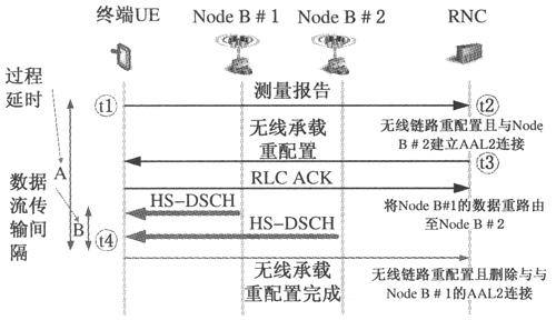 圖2中,傳輸時(shí)間間隔用時(shí)刻B表示,該時(shí)間可以忽略,因?yàn)閁E從源小區(qū)到目標(biāo)小區(qū)的切換是與網(wǎng)絡(luò)同步的。因此,對于像VoIP這樣的低延時(shí)實(shí)時(shí)業(yè)務(wù)來說,HSPA可以提供無縫的移動(dòng)性。