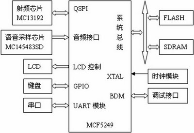 除內(nèi)核外,完整的操作系統(tǒng)還需要編寫鍵盤,LCD,音頻驅(qū)動和射頻芯片驅(qū)動。音頻驅(qū)動采用Phlips I2S數(shù)據(jù)格式,設(shè)定采樣率為8KHz。射頻芯片驅(qū)動采用Freescale公司為MC13192提供的配套軟件模塊。