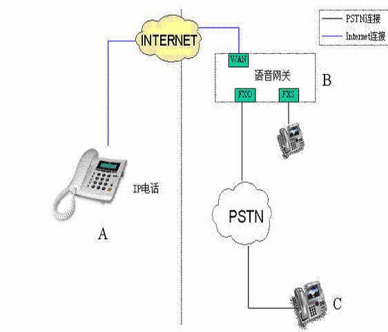 反之如果B點的當?shù)仉娫捰脩鬋,透過電話撥接到B點的FXO口,然后利用INTERNET網(wǎng)絡轉(zhuǎn)接回A點,這就是上車。