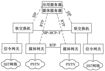 在VoIP業(yè)務的網絡環(huán)境中,主要有軟交換機(Softswitch)、媒體網關(MG)、信令網關(SG)和應用服務器(ApplicationServer)4個基本控件。其業(yè)務環(huán)境如圖2所示。