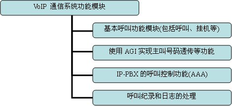 如果是基于純軟件的實(shí)現(xiàn)方案,Asterisk是構(gòu)建VoIP項(xiàng)目的核心,系統(tǒng)中所有與用戶呼叫有關(guān)的功能和管理都通過(guò)它來(lái)實(shí)現(xiàn),包括VoIP各種協(xié)議的互通和配置,以及各種呼叫設(shè)備的配置文件。本文檔所討論的VoIP通信系統(tǒng)基本功能如圖3-2所示,一般的Asterisk的任務(wù)包括了兩方面,一是與呼叫有關(guān)的,包括基本呼叫處理、主叫號(hào)碼透?jìng)鳌⒑艚屑o(jì)錄和日志生成等,二是與呼叫控制有關(guān),即終端用戶的認(rèn)證計(jì)費(fèi)功能。