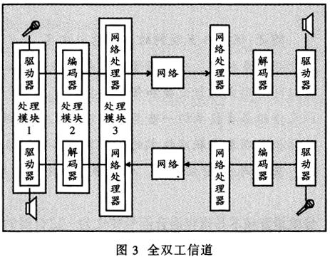 ——傳輸是依靠每一端三級的同步有效操作。如圖3所示,在像IP電話這樣的全雙工通信中,每一端的六級都是連續(xù)工作的。因此在具體應用時為了減少分離處理的數(shù)量,這六級被合成同時工作的三個處理過程。
