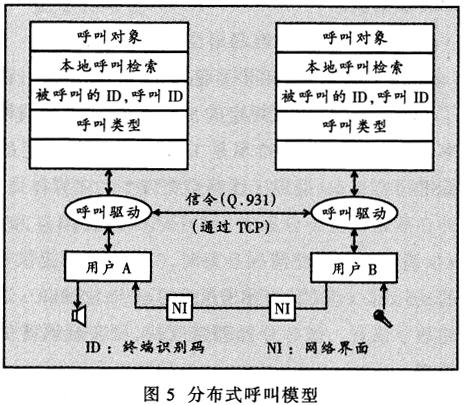 ——IP電話采用分布式的呼叫模式。因為不需要通過電路交換完成呼叫,所以每個終端都使用了呼叫處理器。單工呼叫模式僅支持一個終端的呼叫,且需要本地呼叫驅(qū)動的支持。通過觸發(fā)本地呼叫驅(qū)動軟件建立一次呼叫,而呼叫驅(qū)動利用傳輸控制協(xié)議(TCP)的套接字(Socket)與另一端的呼叫驅(qū)動建立信令連接,從而觸發(fā)另一端的單工呼叫。這兩個單工呼叫被觸發(fā)后按照Q.931信令協(xié)議完成呼叫過程的建立。根據(jù)信令的引導,呼叫驅(qū)動程序啟動語音信息流接入網(wǎng)絡和對端的接收設備,建立一個完整的呼叫過程(圖5)。圖5中的呼叫對象指明本次呼叫的域名、兩端的終端識別碼(ID)或電話號碼、呼叫類型(如單純語音、語音和數(shù)據(jù))等信息。