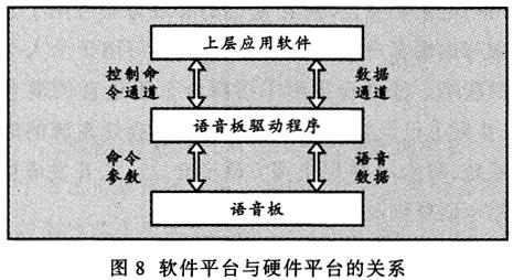 ——為便于在Windows95環(huán)境下使用該平臺,開發(fā)了虛擬設備驅(qū)動程序。該程序為上層軟件提供了豐富的接口函數(shù),用于實現(xiàn)對語音板的操作。軟件平臺與硬件平臺的關系如圖8所示。