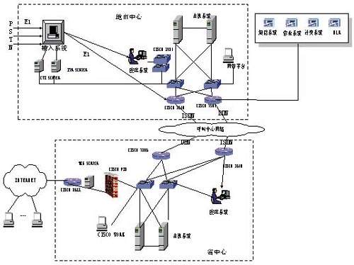 1924和中心交換機(jī)互聯(lián);在廣域網(wǎng)上,各地市和省中心通過2M DDN線路實(shí)現(xiàn)互聯(lián),通過ISDN線路實(shí)現(xiàn)線路備份,考慮到WEB受理的需要,全省呼叫中心系統(tǒng)設(shè)置統(tǒng)一的WEB服務(wù)器,設(shè)在省中心,通過CISCO