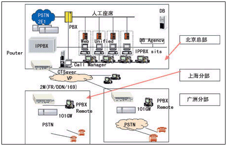 分布式呼叫中心一般由總中心和分中心組成,它們之間可以是對等關系或隸屬關系,各中心分布于不同的地理位置,在運作時間、資源、功能上互相協(xié)作,為用戶提供最大限度的服務。分布式呼叫中心在功能上的突出需求為:用戶打入的電話可以在各分呼叫中心之間轉接,即實現(xiàn)網(wǎng)絡ACD;不論用戶資料存放于何地理位置的數(shù)據(jù)庫,它都應能在電話被派到話務員座席時,在來電信息中彈出,即實現(xiàn)遠程數(shù)據(jù)訪問;具有響應IP電話的能力,以處理通過IP網(wǎng)絡傳送過來的異地用戶呼叫或Web呼叫;呼叫排隊模塊應具有較強的路由能力,以使異地用戶能直接被最適合的話務員接聽。