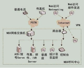 NBX呼叫中心是基于3Com公司NBX網(wǎng)絡(luò)電話交換機(jī)平臺(tái)構(gòu)筑的、語(yǔ)音數(shù)據(jù)合一的呼叫中心。系統(tǒng)配置拓?fù)浣Y(jié)構(gòu)如圖3所示。