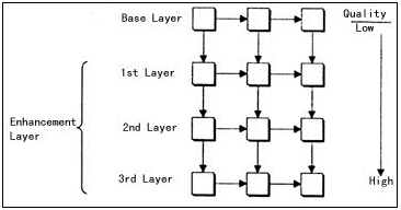 關(guān)于分層可擴(kuò)展性編碼的研究可以追溯到10年前,目前它已經(jīng)被許多現(xiàn)行的國際壓縮標(biāo)準(zhǔn)接納,例如H.263+和MPEG-4。分層可擴(kuò)展編碼主要有三種:時(shí)域可擴(kuò)展性、空域可擴(kuò)展性和質(zhì)量可擴(kuò)展性。其中質(zhì)量可擴(kuò)展性也稱為PSNR可擴(kuò)展性,原因是視頻質(zhì)量通常用峰值信噪比(PSNR)來衡量。