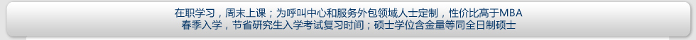 | 報名條件 | 擁護中國憲法,遵守法律、法規(guī),品行端正,身體健康,并能堅持在職學習; 大專及以上學歷,旨在提高本人專業(yè)素質(zhì)和學歷層次的 社會在職人士均可報名;擇優(yōu)錄取。 呼叫中心、服務(wù)外包領(lǐng)域的中高級從業(yè)者,英語基礎(chǔ)良好的人士將獲得優(yōu)先錄取機會。 |