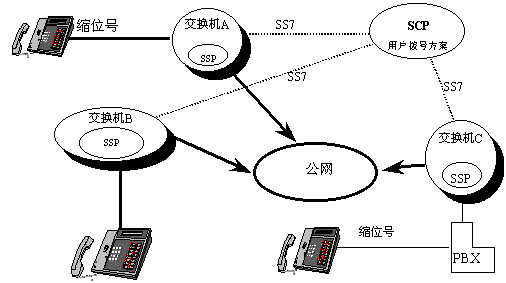 縮位撥號(hào)是指用一短的撥號(hào)(如三位)代替一長(zhǎng)的撥號(hào)(如八位)的撥號(hào)方案。如下圖所示的智能網(wǎng)中,交換機(jī)A、B、C所有用戶的撥號(hào)方案數(shù)據(jù)都由SCP管理,當(dāng)交換機(jī)收到用戶的縮位撥號(hào)后,通過(guò)SS7鏈路訪問(wèn)SCP數(shù)據(jù)庫(kù),返回對(duì)應(yīng)的電話號(hào)碼,然后交換機(jī)通過(guò)公網(wǎng)把呼叫接通到該電話號(hào)碼,就和用戶直接撥打該電話號(hào)碼一樣。