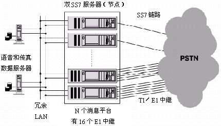 圖6所示為一個運營級的聲訊平臺,這是個面向公眾的開放結構增強業(yè)務平臺。系統(tǒng)由多臺計算機(或叫節(jié)點)組成,節(jié)點間通過以太網相連接以提供冗余功能,這是一個很規(guī)范、具有很高可靠性的系統(tǒng)。在這一例子中,兩個SS7節(jié)點用于為應用提供信令,而其它幾個媒體節(jié)點用于提供和PSTN間的通道連接和呼叫處理功能,包括所有和用戶的音頻或聲音對話,以及信息播放。每個媒體節(jié)點一般使用有一定數(shù)量的線路和DSP資源的板卡,比如NMS