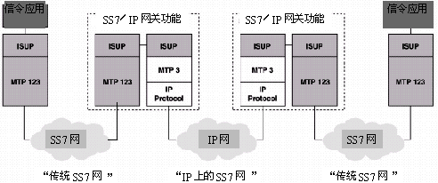 就是兩個PSTN網絡之間通過IP網絡連接起來,PSTN網絡間的SS7信令信息通過IP網透明地傳送到對方。這樣做的目的是:不管呼叫是通過基于電路的PSTN還是通過VoIP網絡,都能向用戶提供相同的隨時隨地的接入和業(yè)務功能集。另外,通過IP網傳遞SS7所需要的基礎傳輸設備成本明顯要比傳送傳統(tǒng)SS7所需要的基礎傳輸設備低得多。(參考圖9)