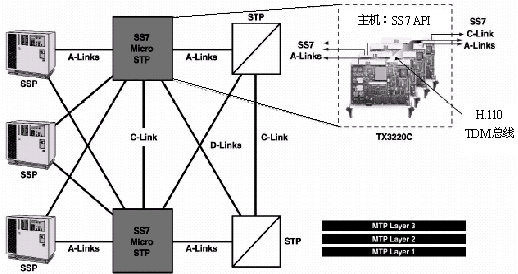 微型STP連接多條從SSP來的鏈路,并把它們集中到一個連接STP的鏈路集之中,這一鏈路集有兩條鏈路。微型STP到每個SSP也有兩條鏈路組成的一個鏈路集。微型STP由完全相同配置的一對構成,以實現(xiàn)高可用性和高可靠性,兩個STP之間用交叉鏈路(C鏈路)相連接。另外,微型STP上的每個端口可以設置一個唯一的信令點編碼,以便移除SS7鏈路時不影響端點SSP。