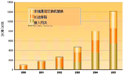 隨著因特網(wǎng)業(yè)務的普及,與傳統(tǒng)電信業(yè)務供應商形成競爭、替代局面的新業(yè)務供應商看到了重大的機會:利用通過包網(wǎng)絡傳送話音(VoP)業(yè)務取代分離的話音/數(shù)據(jù)網(wǎng)業(yè)務。VoP技術最初主要用于長途旁路。在過去的兩年里,VoP網(wǎng)絡的發(fā)展勢頭明顯加快,通過寬帶網(wǎng)傳送話音的接入網(wǎng)關正在推廣,利用VoP本地網(wǎng)關代替?zhèn)鹘y(tǒng)中心局交換機的機會也已出現(xiàn)。圖1用圖例說明了VoP在交換機替換、長途旁路和接入網(wǎng)關方面市場的分塊大小以及對末來的預測。