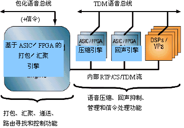 這種新型半導體元件被叫作語音處理器(VP),它不是技術創(chuàng)新成果,而只是傳統(tǒng)DSP核心和通用RISC處理器在一個或兩個硅片上的重新包裝和集成。DSP核心完成VoP的壓縮、回聲抑制和各種信號處理任務,而RISC處理器完成VoP的匯聚和打包處理。