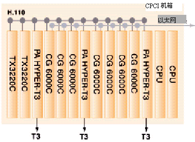 HYPER-T3接入適配板,它用于通過T3線上的1344個(gè)端口從PSTN接入語音和傳真媒體。這些媒體會(huì)從DS3轉(zhuǎn)換到DS0,然后通過H.110總線發(fā)送給6塊CG6000C中的一塊。CG6000C會(huì)壓縮這些語音和傳真媒體,然后用UDP/IP上實(shí)時(shí)協(xié)議(RTP)對(duì)它們進(jìn)行打包。再通過板上的兩個(gè)以太網(wǎng)接口發(fā)送到一個(gè)語音級(jí)的IP包網(wǎng)絡(luò)上。請(qǐng)注意,每種板都使用了N+1板卡級(jí)的冗余備份。
