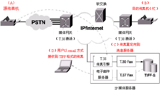 T.38規(guī)定了實時IP傳真的標準。因此,源于PSTN的一個傳真會話能夠以T.38的格式進入IP網絡。在IP媒體服務器中通過使用T.30,T.38和T.37,實時傳真會話可以把IP媒體服務器作為終端,并把實時傳真轉換成T.37兼容的傳真消息。然后,這個傳真消息會被用來產生一個就象一個電子郵件會話的T.37傳真。這使得IP媒體服務器可以提供"永不示忙"的IP傳真功能。這個功能也將為統(tǒng)一消息應用提供基于IP的傳真郵箱能力。
