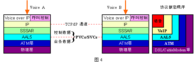 除了上面的LES外,還可以通過AAL5進行話音傳送。下圖4為其協(xié)議模型。實質上這是通過兩次映射完成的:首先進行的是VoIP技術,之后把這些語聲IP包通過IPoATM(LANE)傳送。看起來似乎過于羅嗦,但這樣做的目的是充分利用VoIP技術的靈活性和AAL5的優(yōu)點(開銷小、糾錯強,支持多種業(yè)務速率/變速率),也即,它必須建立在ATM網絡的高可靠性和VoIP的充分成熟基礎之上;就目前的技術發(fā)展而言,這兩個條件都已具備了。圖4中的右邊給出了基于AAL5的典型VoATM應用模型。