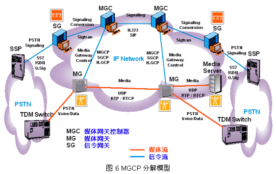 為了進一步說明,圖6給出了MGCP協(xié)議模型的另一種表示:概念分解模型(請對照圖4、圖5)。下面介紹MGCP協(xié)議模型中最重要的協(xié)議:MGCP和SIP。