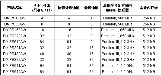為了讓客戶根據(jù)需要可以選擇不同媒體處理資源的組合, HMP軟件提供一系列的資源配置. 這些資源配置列在下面, 包括它們的市場名稱,