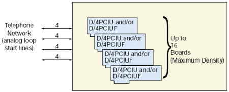 D/4PCIU和D/4PCIUF板卡安裝在計算機里(基于Pentium? 處理器的PC) ,可以提供4到64線的集成的,不使用CTbus總線的語音解決方案。