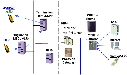 Gateway CRBT業(yè)務(wù)的主體——用戶,可以通過IVR、Internet、WAP或SMS-MO等手段進(jìn)行業(yè)務(wù)注冊(cè)/注銷,回鈴音定制、修改、增加等操作,而所有這些操作都是通過CRBT