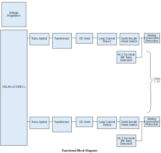 來自12個環(huán)路電話線的信號首先通過電話線路接口連接到D/120JCT-LS板卡上,該接口提供瞬變保護和電磁干擾(EMI)刪除(參見子板塊圖)。這些電話線路接口使用可靠的晶體摘掛機開關(無機械接觸)和FCC-Part
