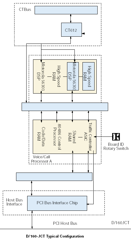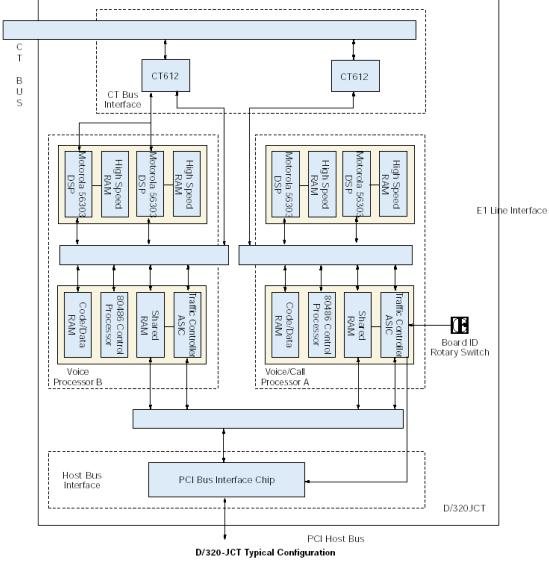 D/320-JCT板卡通過(guò)與外部網(wǎng)絡(luò)連接的CT總線接口與網(wǎng)絡(luò)接口板卡相連。DSP資源通過(guò)一個(gè)CT612模塊接收數(shù)字語(yǔ)音數(shù)據(jù),CT612作為到CT總線的接口。DSP基于下載到它的高速RAM中的Spring