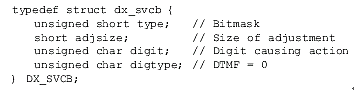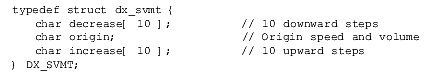速度/音量調(diào)節(jié)表(DX_SVMT)數(shù)據(jù)結(jié)構(gòu)有21個(gè)代表不同級(jí)別的速度和音量的條目,用于指定信道的速度或者音量調(diào)節(jié)的變化率。這些值可以設(shè)置或者用dx_setsvmt()和dx_getsvmt()從表中取值。