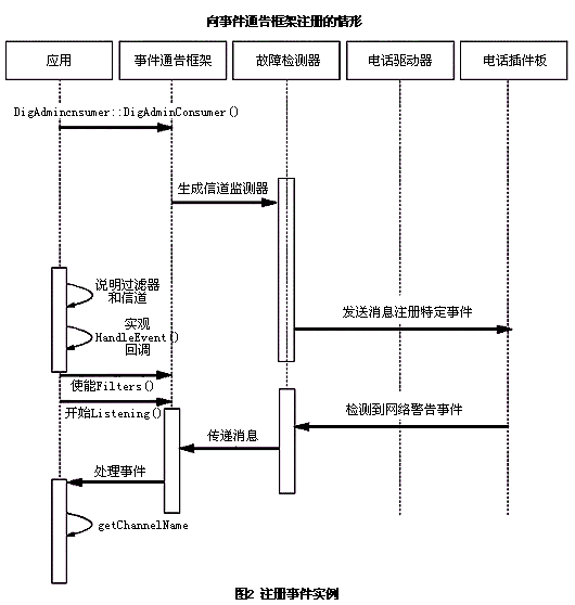 。。系統(tǒng)版包括事件服務API和事件通告框架。這些API用來向事件通告框架注冊你的應用。框架是使所有操作、管理、維護和定制服務(OAM&P)向已注冊的電話應用發(fā)送異步消息的子系統(tǒng)。關于事件服務API和事件通告框架的詳細信息,可以參考系統(tǒng)版文檔中的編程指南。框架含有不同信道,這些信道用來報告與操作人員的一些被動或者主動的動作相關的事件。