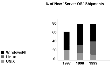 而且,在1999年Linux服務(wù)器增長(zhǎng)率大約在98.3%,遠(yuǎn)遠(yuǎn)超過居于第二位的Windows的24%的增長(zhǎng)率。