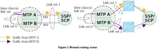 正常運行狀態(tài)下,可用的鏈路在MTP A和MTP B之間平均分配。MTP A從本地SS7協(xié)議的第4層(User part)接收到的消息在與相鄰節(jié)點的鏈路上發(fā)送。同樣,MTP