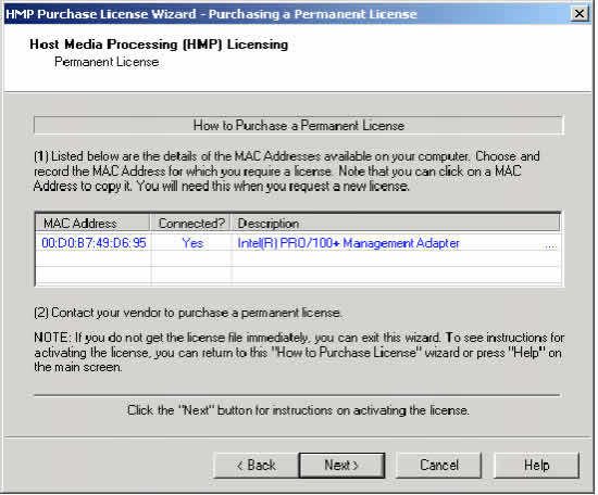 5. 聯(lián)系你的廠家購買一個(gè)永久許可證。你必須提供從在4步中得到的MAC地址。可獲得的許可證列表參見表3""HMP